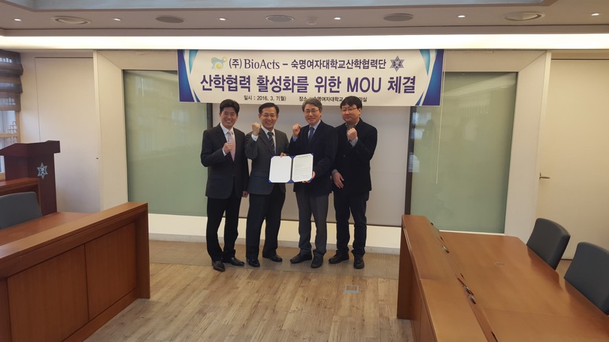 On March 7, 2016, an MOU was signed with Sookmyung Women's University to collaborate with industry-academia cooperation with BioActs. The Convention will be actively exchanged for the purpose of joint development through mutual exchange and cooperation between industry and academia. |