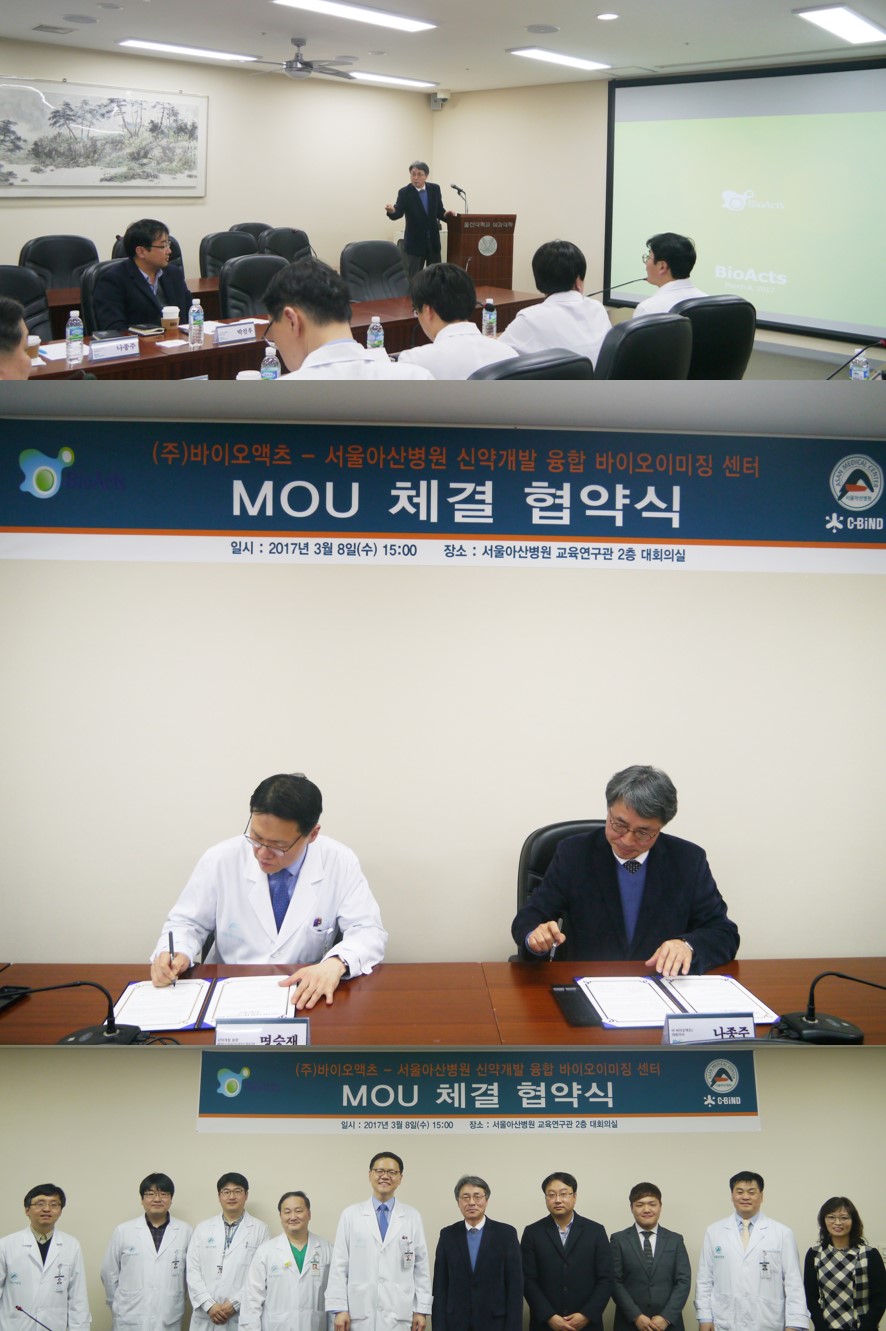 On March 8, 2017, MOU was signed between Asan Medical Center's new drug development bio-imaging center (C-BIND) and BioActs. Biosimilar analysis and active exchange of academic information will be carried out through friendly cooperation between the two institutions. We will look for products optimized for various fields of experiment and purpose of bio-imaging.