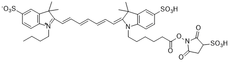 Flamma® Fluors 749 NHS Sulfo-ester is a reactive form of near infrared (NIR) fluorescent dye induced from cyanine structure and used to generate a stable fluorescence signal in bioimaging. The maxima of Ex/Em values are at 749/774 nm, similar to that of Alexa 750, Cy7.5, IRDye 750 and Dylight 755. Flamma 749 might be excited using 750 nm laser line or dye-pumped laser excitation and the emission occurs at biological tissue permeable NIR region. Flamma Fluors 749-conjugated primary and secondary antibody are used as molecular probes for in vitro imaging and other fluorescence detection methods. Sulfo-NHS esters have higher water solubility than NHS esters, thus they do not need organic co-solvent and readily react with amine-modified oligonucleotides or amino groups of proteins, i.e. the ε-amino groups of lysine or the amine terminus of nucleotides to form a stable amide bond between dye and the biomolecule. We offer Flamma Fluors 749 Sulfo-NHS ester for labeling of antibodies, peptides, proteins, ligands, and in vivo NIR imaging.