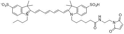 Flamma® Fluors 749 Maleimide is a thiol reactive near infrared (NIR) fluorescent dye induced from cyanine structure and used to generate a stable fluorescence signal in bioimaging. The maxima of Ex/Em values are at 749/774 nm, similar to that of Alexa 750, Cy7, IRDye 750 and DyLight 755. Flamma 749 might be excited using 750 nm laser line or dye-pumped laser excitation and the emission occurs at biological tissue permeable NIR region. Flamma 749-conjugated primary and secondary antibodies are used as molecular probes for in vitro imaging and other fluorescence detection methods. Maleimides selectively label thiols of cysteine residue via 1,4-addition pathway, without interacting with amines, to form thioether linkage. Maleimides apparently do not react with methionine, histidine or tyrosine, but they might react with primary amines under strong basic environment. We offer Flamma Fluors 749 Maleimide for labeling of antibodies, peptides, proteins, ligands and in vivo NIR imaging.