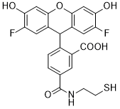 Flamma® Fluors 496 Thiol is inactive form of bright green fluorescent dye induced from fluorescein structure and used to generate a stable fluorescence signal in bioimaging. The thiol is attached to Flamma 496 fluorophore through a spacer. The maxima of Ex/Em values are at 494/520 nm, similar to that of Fluorescein. Flamma 496 might be excited using 488 nm laser line and displays excellent optical property. Flamma® Fluors 496 thiol can be labeled to biomolecules through a disulfide bond formation with thiol of cysteine residue or can be utilized as a reference standard for dye-conjugates.