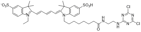Flamma® Fluors 648 Dichlorotriazine is a hydroxyl reactive far-red fluorescent dye induced from cyanine structure and used to generate a stable fluorescence signal in bioimaging. The maxima of Ex/Em values are at 648/663 nm, similar to that of Alexa 647, Cy5 and DyLight 650. Flamma 648 might be excited using 593 or 633 nm laser lines and displays excellent optical property. Hydroxyls irreversibly displace one of chlorines at triazine ring to yield an aryl ether linkage. Dichlorotriazines are among the few reactive groups that are reported to react directly with polysaccharides and other alcohols in aqueous solution, provided that the pH is >9 and other nucleophiles are not present. We offer Flamma Fluors 648 dichlorotriazine for labeling of polysaccharides and alcohols on biomolecules for cellular labeling and detection.