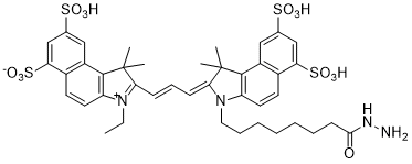 Flamma® Fluors 581 Hydrazide is a reactive form of orange fluorescent dye induced from benzindocyanine structure and used to generate a stable fluorescence signal in bioimaging. The maxima of Ex/Em values are at 578/593 nm, similar to that of Alexa 594 and DyLight 594. Flamma 581 might be excited using 561, 568 or 578 nm laser lines and displays excellent optical property. Hydrazides can label aldehyde and ketone through reductive amination reaction to form an imine linkage. The main labeling target for hydrazides are free reducing sugars on biomolecules, and prior to conjugation, primary and secondary alcohols on polysaccharide and glycoprotein are usually oxidized to aldehyde and ketone. We offer Flamma Fluors 581 hydrazide for labeling of polysaccharide, glycoprotein and other biomolecules bearing aldehyde or ketone.