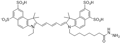 Flamma® Fluors 675 Hydrazide is a reactive form of near infrared (NIR) fluorescent dye induced from benzindocyanine structure and used to generate a stable fluorescence signal in bioimaging. The maxima of Ex/Em values are at 675/691 nm, similar to that of Alexa 680, Cy5.5, IRDye 680LT and DyLight 680. Flamma 675 might be excited using 633 nm laser line and the emission occurs at biological tissue permeable NIR region. Hydrazides can label aldehyde and ketone through reductive amination reaction to form an imine linkage. The main labeling target for hydrazides are free reducing sugars on biomolecules, and prior to conjugation, primary and secondary alcohols on polysaccharide and glycoprotein are usually oxidized to aldehyde and ketone. We offer Flamma Fluors 675 hydrazide for labeling of polysaccharide, glycoprotein and other biomolecules bearing aldehyde or ketone.