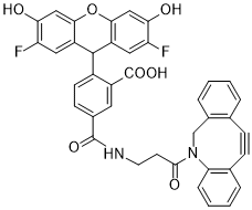 Flamma® Fluors 496 ADIBO is a strain-promoted azide-alkyne cycloaddition (SPAAC) reagent of bright green dye induced from fluorescein structure and used to generate a stable fluorescence signal in bioimaging. The maxima of Ex/Em values are at 496/520 nm, similar to that of Alexa 488 and Fluorescein. Flamma 496 might be excited using 488 nm laser line and displays excellent optical property. Flamma 496 ADIBO couples with an azide to form 1,4-disubstituted 1,2,3-triazole inside of living systems without using any coupling reagents or catalyst nor interfering native biochemical processes. Prior to perform SPAAC, the azide functionality should be introduced onto counterpart biomolecule by means of chemical or genetic modification. We offer Flamma Fluors 496 ADIBO as a click chemistry reagent dye for cellular imaging and nucleotide functionalization.