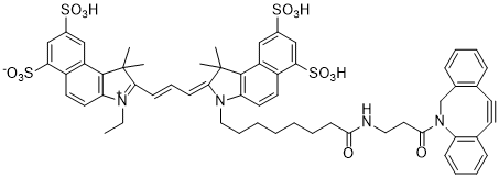 Flamma® Fluors 581 ADIBO is a strain-promoted azide-alkyne cycloaddition (SPAAC) reagent of orange dye induced from benzindocyanine structure and used to generate a stable fluorescence signal in bioimaging. The maxima of Ex/Em values are at 581/595 nm, similar to that of Alexa 594 and DyLight 594. Flamma 581 might be excited using 561, 568 or 578 nm laser lines and displays excellent optical property. Flamma 581 ADIBO couples with an azide to form 1,4-disubstituted 1,2,3-triazole inside of living systems without using any coupling reagents or catalyst nor interfering native biochemical processes. Prior to perform SPAAC, the azide functionality should be introduced onto counterpart biomolecule by means of chemical or genetic modification. We offer Flamma Fluors 581 ADIBO as a click chemistry reagent dye for cellular imaging and nucleotide functionalization.