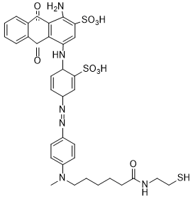 qFlamma® Black01 Thiol is an inactive form of universal dark quencher that the range of absorption covers from 400 to 800 nm with no native fluorescence. Black01 quencher displays high absorption coefficient, superb stability and aqueous solubility. The thiol is attached to Black01 quencher through a spacer. qFlamma® Black01 thiol can be labeled to thiol of probes or biomolecules through a disulfide bond formation or can be utilized as a reference standard for fluorophore-quencher pair probes.