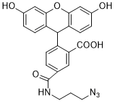 FAM Azide is a copper (I)-catalyzed azide-alkyne cycloaddition (CuAAC) reagent of bright green dye used to generate a stable fluorescence signal in bioimaging. The maxima of Ex/Em values are at 494/520 nm, similar to that of Alexa 488 and Cy2. FAM might be excited using 488 nm laser line and displays good optical property. FAM azide couples with an alkyne to form 1,4-disubstituted 1,2,3-triazole inside of living systems without interfering native biochemical processes. Prior to perform CuAAC, the alkyne functionality should be introduced onto counterpart biomolecule by means of chemical or genetic modification. We offer FAM azide as a click chemistry reagent dye for cellular imaging and nucleotide functionalization.