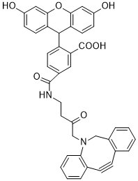 FAM ADIBO is a strain-promoted azide-alkyne cycloaddition (SPAAC) reagent of bright green dye used to generate a stable fluorescence signal in bioimaging. The maxima of Ex/Em values are at 494/522 nm, similar to that of Alexa 488 and Cy2. FAM might be excited using 488 nm laser line and displays good optical property. FAM ADIBO couples with an azide to form 1,4-disubstituted 1,2,3-triazole inside of living systems without using any coupling reagents or catalyst nor interfering native biochemical processes. Prior to perform SPAAC, the azide functionality should be introduced onto counterpart biomolecule by means of chemical or genetic modification. We offer FAM ADIBO as a SPAAC reagent dye for cellular imaging and nucleotide functionalization.