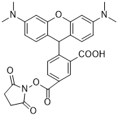 TAMRA NHS ester is a reactive form of bright yellow dye that used to generate a stable fluorescence signal in bioimaging. The maxima of Ex/Em values are at 553/578 nm, similar to that of DyLight 549, ATTO 550 and Cy 3. TAMRA might be excited using 543 or 546 nm laser line and displays good optical property. NHS esters readily react with amine-modified oligonucleotides or amino groups of proteins, i.e. the ε-amino groups of lysine or the amine terminus of nucleotides to form a chemically stable amide bond between dye and the biomolecule. We offer TAMRA NHS ester for labeling of antibodies, peptides, proteins and oligonucleotide labeling and automated DNA sequencing applications.