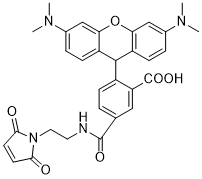 TAMRA Maleimide is a thiol reactive bright yellow dye that used to generate a stable fluorescence signal in bioimaging. The maxima of Ex/Em values are at 553/575 nm, similar to that of DyLight 549, ATTO 550 and Cy 3. TAMRA might be excited using 543 or 546 nm laser line and displays good optical property. Maleimides selectively label thiols of cysteine residue via 1,4-addition pathway, without interacting with amines, to form thioether linkage. Maleimides apparently do not react with methionine, histidine or tyrosine, but they might react with primary amines under strong basic environment. We offer TAMRA maleimide for labeling of antibodies, peptides, proteins and oligonucleotide labeling and automated DNA sequencing applications.
