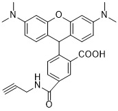 TAMRA Alkyne is a copper (I)-catalyzed azide-alkyne cycloaddition (CuAAC) reagent of bright yellow dye that used to generate a stable fluorescence signal in bioimaging. The maxima of Ex/Em values are at 551/573 nm, similar to that of DyLight 549, ATTO 550 and Cy 3. TAMRA might be excited using 543 or 546 nm laser line and displays good optical property. TAMRA alkyne couples with an azide to form 1,4-disubstituted 1,2,3-triazole inside of living systems without interfering native biochemical processes. Prior to perform CuAAC, the azide functionality should be introduced onto counterpart biomolecule by means of chemical or genetic modification. We offer TAMRA alkyne as a CuAAC reagent dye for cellular imaging and nucleotide functionalization.