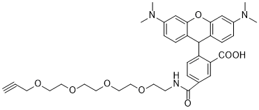 TAMRA PEG4-Alkyne is a copper (I)-catalyzed azide-alkyne cycloaddition (CuAAC) reagent of bright yellow dye that used to generate a stable fluorescence signal in bioimaging. The maxima of Ex/Em values are at 543/575 nm, similar to that of DyLight 549, ATTO 550 and Cy 3. TAMRA might be excited using 543 or 546 nm laser line and displays good optical property. The alkyne reactive group is connected to the dye through a tetraethylene glycol spacer. TAMRA PEG4-alkyne couples with an azide to form 1,4-disubstituted 1,2,3-triazole inside of living systems without interfering native biochemical processes. Prior to perform CuAAC, the azide functionality should be introduced onto counterpart biomolecule by means of chemical or genetic modification. We offer TAMRA PEG4-alkyne as a click chemistry reagent dye for cellular imaging and nucleotide functionalization.