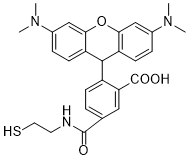 TAMRA Thiol is an inactive form of bright yellow dye that used to generate a stable fluorescence signal in bioimaging. The maxima of Ex/Em values are at 553/575 nm, similar to that of DyLight 549, ATTO 550 and Cy 3. TAMRA might be excited using 543 or 546 nm laser line and displays good optical property. The thiol is attached to TAMRA fluorophore through an aminoethyl linkage. TAMRA thiol can be labeled to biomolecules through a disulfide bond formation with thiol of cysteine residue or can be utilized as a reference standard for dye-conjugates.