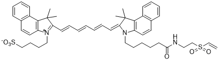 ICG Vinylsulfone is pH insensitive amine-reactive near infrared (NIR) fluorescent dye and used to generate a stable fluorescence signal in bioimaging. NIR fluorescence allows to observe the deep image from the surface of skin and being utilized in a wide range of research fields. Vinylsulfone reactive group, developed by BioActs’ leading technology, is stable in a wide range of pH and at the high temperature. The maxima of Ex/Em values are at 785/812 nm. ICG might be excited using 750-800 nm laser line or LED and displays excellent optical property. Vinylsulfones readily react with primary amines of amino-modified oligonucleotides or of proteins to form a stable amino linkage between dye and the biomolecule. BioActs provides ICG dye for various biological research and medical diagnostics. We offer ICG Vinylsulfone for labeling of antibodies, peptides, proteins, ligands, and amplification substrates optimized for cellular labeling and NIR imaging.