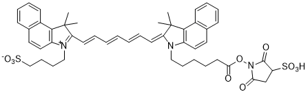 ICG Sulfo-NHS ester is an amine-reactive form of near infrared (NIR) fluorescent dye and used to generate a stable fluorescence signal in bioimaging. NIR fluorescence allows to observe the deep image from the surface of skin and being utilized in a wide range of research fields. The maxima of Ex/Em values are at 785/812 nm. ICG might be excited using 750-800 nm laser line or LED and displays excellent optical property. Sulfo-NHS esters have higher water solubility than NHS esters, thus they do not need organic co-solvent and readily react with amine-modified oligonucleotides or amino groups of proteins, i.e. the ε-amino groups of lysine or the amine terminus of nucleotides to form a stable amide bond between dye and the biomolecule. We offer ICG Sulfo-NHS ester for labeling of antibodies, peptides, proteins, ligands, and amplification substrates optimized for cellular labeling and NIR imaging.