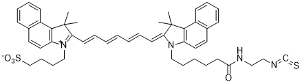 ICG Isothiocyanate is an amine-reactive form of near infrared (NIR) fluorescent dye and used to generate a stable fluorescence signal in bioimaging. NIR fluorescence allows to observe the deep image from the surface of skin and being utilized in a wide range of research fields. The maxima of Ex/Em values are at 785/812 nm. ICG might be excited using 750-800 nm laser line or LED and displays excellent optical property. Isothiocyanates are moderately reactive but quite stable in water and most organic solvents. Isothiocyanates react to primary amine to form reasonably stable thiourea linkage. Whereas labeling of protein with NHS esters can typically be done at pH 8.3, conjugation for isothiocyanates usually require pH above 9. We offer ICG isothiocyanate for labeling of antibodies, peptides, proteins, ligands, and amplification substrates optimized for cellular labeling and NIR imaging.