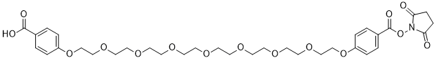 NHS-PEG8B-COOH is a mono-functionalized PEG-based crosslinker that one end of octaethylene glycol derivative is activated as NHS ester and can be used in a range of biological research fields. PEG crosslinkers are hydrophilic and does not penetrate cell membrane and beneficial to transfer their hydrophilic spacer to the crosslinked biomolecule thereby reducing the potential of aggregation and precipitation of the complex. NHS esters readily react with amine-modified oligonucleotides or amino groups of proteins or the amine terminus of nucleotides to form a chemically stable amide bond between dye and the biomolecule. Functionalized crosslinkers are one of well-known protein modification reagents that having a variety of applications in life science research and assay development.