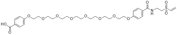 Vinylsulfone-PEG7B-COOH is a mono-functionalized PEG-based crosslinker that one end of heptaethylene glycol derivative is activated as vinylsulfone and can be used in a range of biological research fields. PEG crosslinkers are hydrophilic and does not penetrate cell membrane and beneficial to transfer their hydrophilic spacer to the crosslinked biomolecule thereby reducing the potential of aggregation and precipitation of the complex. Vinylsulfone reactive group, developed by BioActs’ leading technology, is stable in a wide range of pH and at the high temperature and reacts with primary amines. Functionalized crosslinkers are one of well-known protein modification reagents that having a variety of applications in life science research and assay development.
