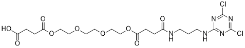 Dichlorotriazine-PEG3-COOH is a mono-functionalized PEG-based crosslinker that one end of triethylene glycol derivative is activated as dichlorotriazine and can be used in a range of biological research fields. PEG crosslinkers are hydrophilic and does not penetrate cell membrane and beneficial to transfer their hydrophilic spacer to the crosslinked biomolecule thereby reducing the potential of aggregation and precipitation of the complex. Dichlorotriazines can react with polysaccharides and other alcohols in basic environment. Functionalized crosslinkers are one of well-known protein modification reagents that having a variety of applications in life science research and assay development.