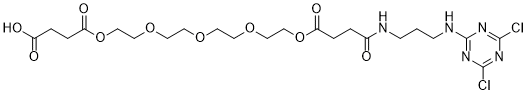 Dichlorotriazine-PEG4-COOH is a mono-functionalized PEG-based crosslinker that one end of tetraethylene glycol derivative is activated as dichlorotriazine and can be used in a range of biological research fields. PEG crosslinkers are hydrophilic and does not penetrate cell membrane and beneficial to transfer their hydrophilic spacer to the crosslinked biomolecule thereby reducing the potential of aggregation and precipitation of the complex. Dichlorotriazines can react with polysaccharides and other alcohols in basic environment. Functionalized crosslinkers are one of well-known protein modification reagents that having a variety of applications in life science research and assay development.