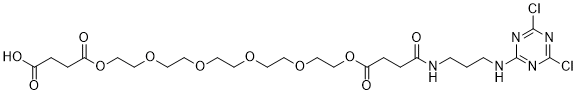 Dichlorotriazine-PEG5-COOH is a mono-functionalized PEG-based crosslinker that one end of pentaethylene glycol derivative is activated as dichlorotriazine and can be used in a range of biological research fields. PEG crosslinkers are hydrophilic and does not penetrate cell membrane and beneficial to transfer their hydrophilic spacer to the crosslinked biomolecule thereby reducing the potential of aggregation and precipitation of the complex. Dichlorotriazines can react with polysaccharides and other alcohols in basic environment. Functionalized crosslinkers are one of well-known protein modification reagents that having a variety of applications in life science research and assay development.
