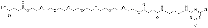 Dichlorotriazine-PEG8-COOH is a mono-functionalized PEG-based crosslinker that one end of octaethylene glycol derivative is activated as dichlorotriazine and can be used in a range of biological research fields. PEG crosslinkers are hydrophilic and does not penetrate cell membrane and beneficial to transfer their hydrophilic spacer to the crosslinked biomolecule thereby reducing the potential of aggregation and precipitation of the complex. Dichlorotriazines can react with polysaccharides and other alcohols in basic environment. Functionalized crosslinkers are one of well-known protein modification reagents that having a variety of applications in life science research and assay development.