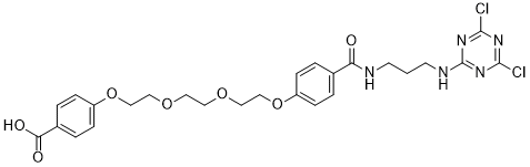 Dichlorotriazine-PEG3B-COOH is a mono-functionalized PEG-based crosslinker that one end of triethylene glycol derivative is activated as dichlorotriazine and can be used in a range of biological research fields. PEG crosslinkers are hydrophilic and does not penetrate cell membrane and beneficial to transfer their hydrophilic spacer to the crosslinked biomolecule thereby reducing the potential of aggregation and precipitation of the complex. Dichlorotriazines can react with polysaccharides and other alcohols in basic environment. Functionalized crosslinkers are one of well-known protein modification reagents that having a variety of applications in life science research and assay development.