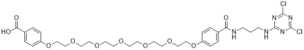 Dichlorotriazine-PEG6B-COOH is a mono-functionalized PEG-based crosslinker that one end of hexaethylene glycol derivative is activated as dichlorotriazine and can be used in a range of biological research fields. PEG crosslinkers are hydrophilic and does not penetrate cell membrane and beneficial to transfer their hydrophilic spacer to the crosslinked biomolecule thereby reducing the potential of aggregation and precipitation of the complex. Dichlorotriazines can react with polysaccharides and other alcohols in basic environment. Functionalized crosslinkers are one of well-known protein modification reagents that having a variety of applications in life science research and assay development.