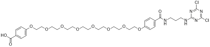 Dichlorotriazine-PEG7B-COOH is a mono-functionalized PEG-based crosslinker that one end of heptaethylene glycol derivative is activated as dichlorotriazine and can be used in a range of biological research fields. PEG crosslinkers are hydrophilic and does not penetrate cell membrane and beneficial to transfer their hydrophilic spacer to the crosslinked biomolecule thereby reducing the potential of aggregation and precipitation of the complex. Dichlorotriazines can react with polysaccharides and other alcohols in basic environment. Functionalized crosslinkers are one of well-known protein modification reagents that having a variety of applications in life science research and assay development.