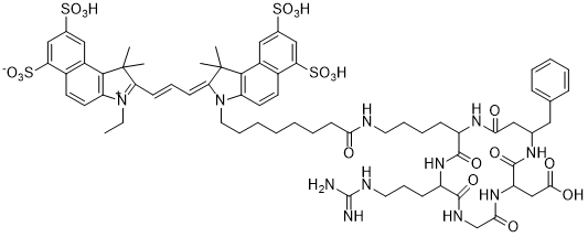cRGD, Flamma® 581 is an angiogenesis imaging fluorescent probe, made up of a covalent-connection of cyclic RGD with Flamma® 581. Cyclic RGD binds preferentially to αvβ3 integrin with high affinity. Integrin αvβ3 is known to strongly involve in the regulation of angiogenesis. The αvβ3 is generally expressed in low levels on the epithelial cells and mature endothelial cells, but it is highly expressed in many solid tumors. Cyclic RGD peptides are also able to bind αvβ5, α5β1, α6β4, α4β1, and αvβ6 integrins, which may help enhance their tumor uptake due to the increased receptor population. We offer cRGD, Flamma® 581 as in vivo fluorescent probes for imaging of blood vessels, tumors and angiogenesis.