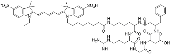 cRGD, Flamma® 648 is an angiogenesis imaging fluorescent probe, made up of a covalent-connection of cyclic RGD with Flamma® 648. Cyclic RGD binds preferentially to αvβ3 integrin with high affinity. Integrin αvβ3 is known to strongly involve in the regulation of angiogenesis. The αvβ3 is generally expressed in low levels on the epithelial cells and mature endothelial cells, but it is highly expressed in many solid tumors. Cyclic RGD peptides are also able to bind αvβ5, α5β1, α6β4, α4β1, and αvβ6 integrins, which may help enhance their tumor uptake due to the increased receptor population. We offer cRGD, Flamma® 648 as in vivo fluorescent probes for imaging of blood vessels, tumors and angiogenesis.
