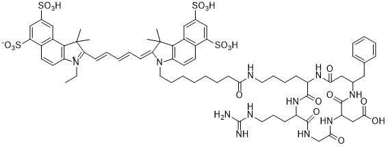 cRGD, Flamma® 675 is an angiogenesis imaging fluorescent probe, made up of a covalent-connection of cyclic RGD with Flamma® 675. Cyclic RGD binds preferentially to αvβ3 integrin with high affinity. Integrin αvβ3 is known to strongly involve in the regulation of angiogenesis. The αvβ3 is generally expressed in low levels on the epithelial cells and mature endothelial cells, but it is highly expressed in many solid tumors. Cyclic RGD peptides are also able to bind αvβ5, α5β1, α6β4, α4β1, and αvβ6 integrins, which may help enhance their tumor uptake due to the increased receptor population. We offer cRGD, Flamma® 675 as in vivo fluorescent probes for imaging of blood vessels, tumors and angiogenesis.